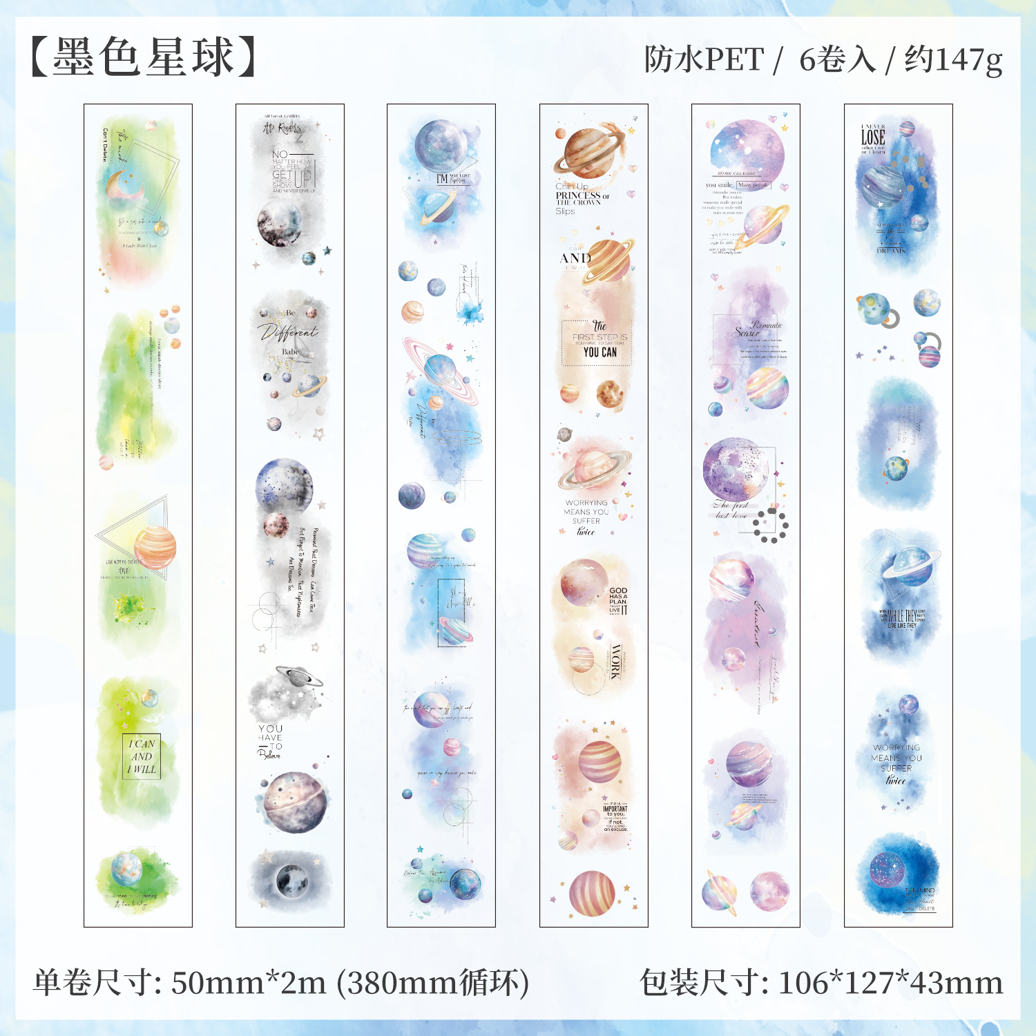 6-roll watercolor planet-themed PET tape set, 1.97 x 78.74 inches